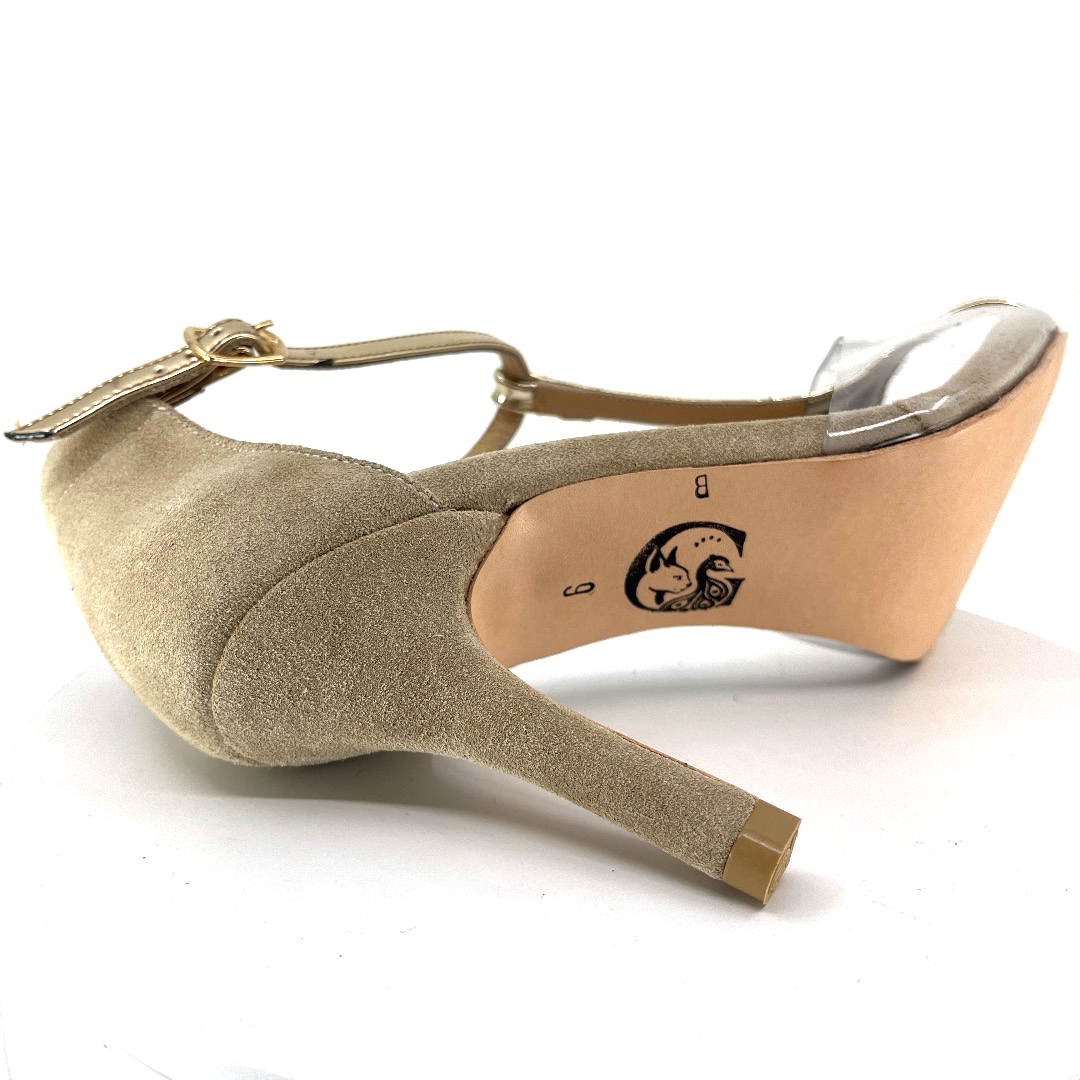 The harmony of beige suede with soft gold genuine leather details creates a warm, luminous presence that never feels overwhelming. Its design gently reflects light, offering a sophisticated glow that follows the rhythm of every step.